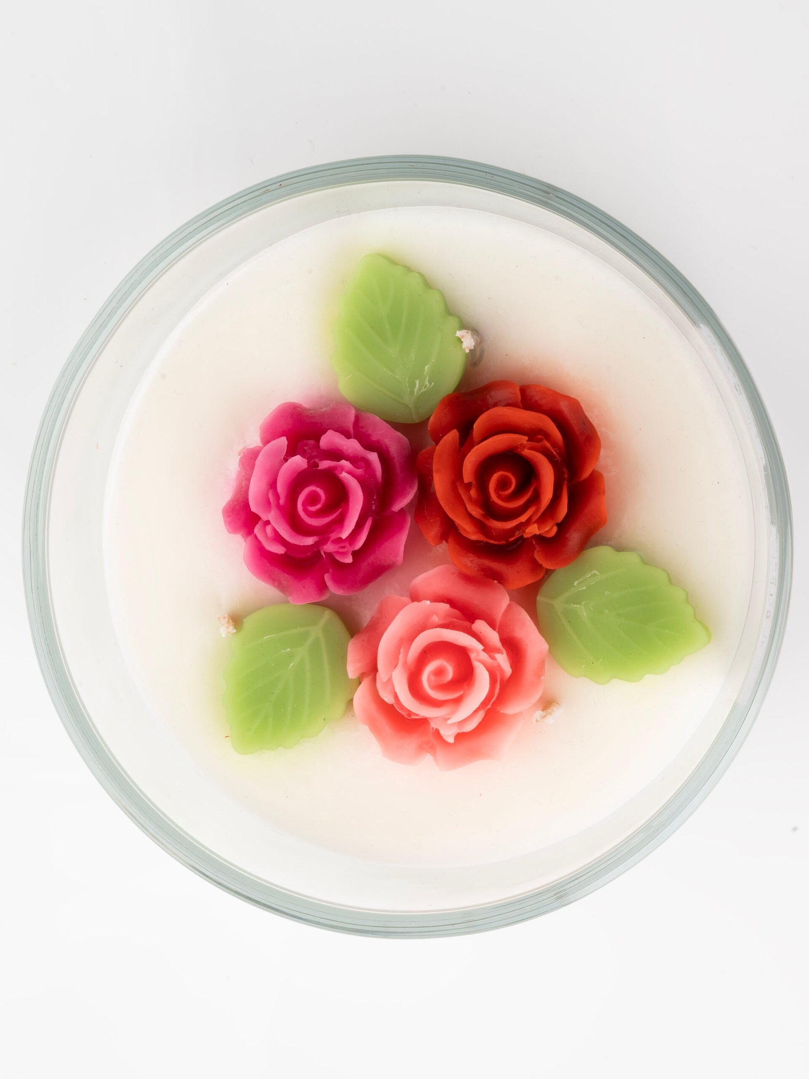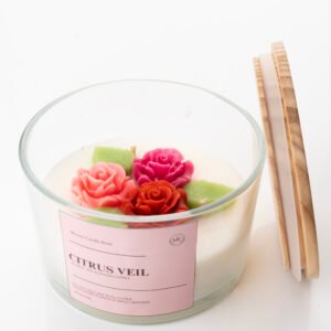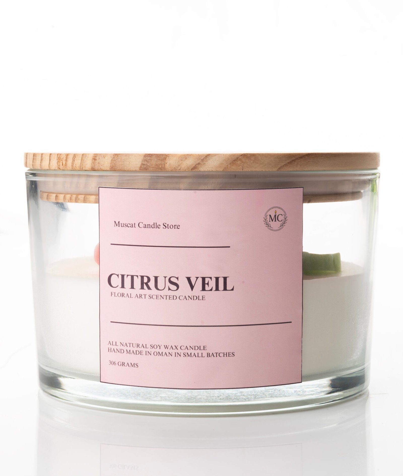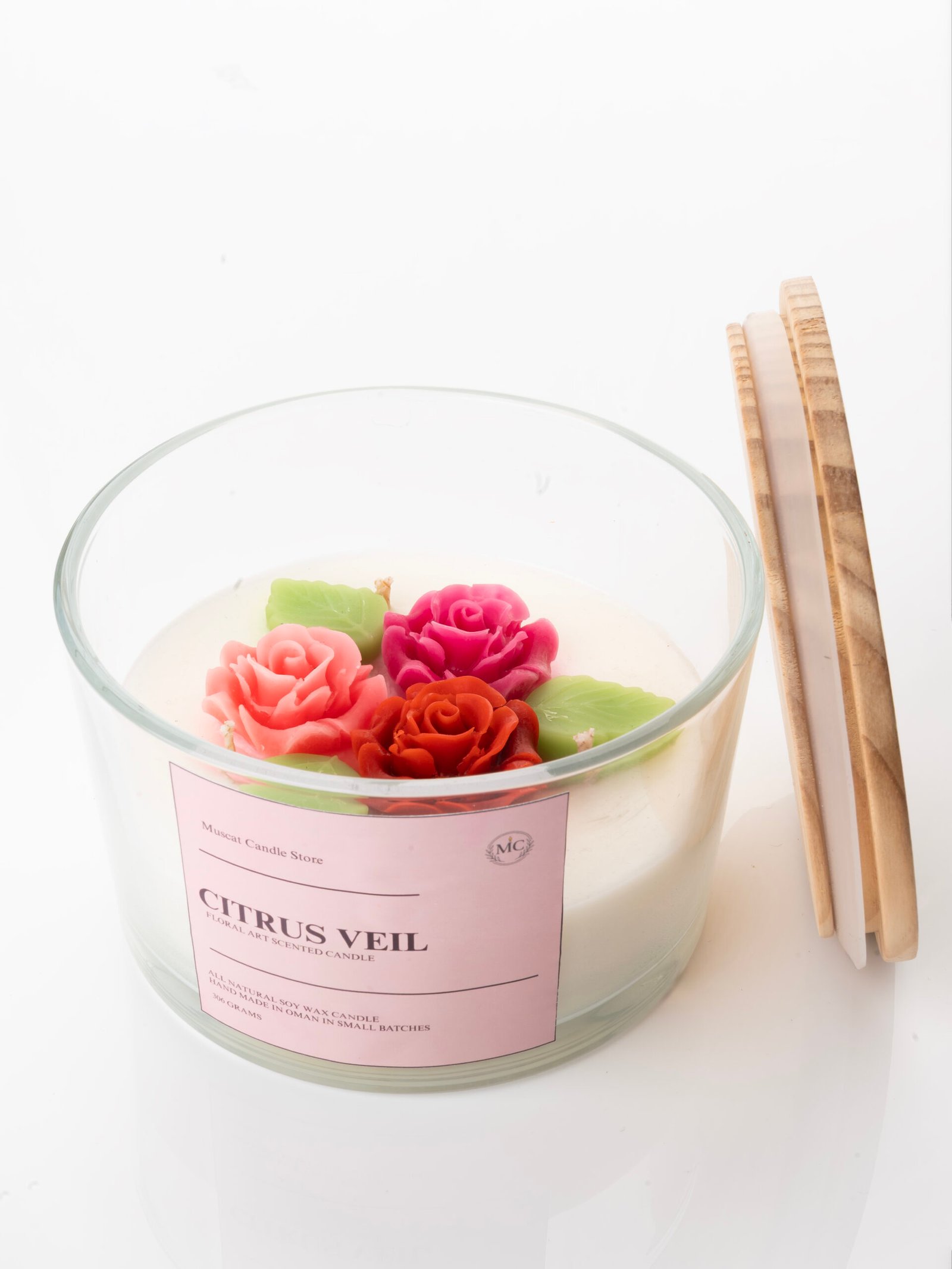 Fresh, colorful, and delightfully uplifting—the Citrus Veil Floral Art Candle by Muscat Candles Store is a handcrafted masterpiece that blends artistry with fragrance. Made with 100% natural soy wax and hand-poured in Oman, this 350g candle features a stunning arrangement of sculpted roses in shades of pink, peach, and red, accented with delicate green leaves.