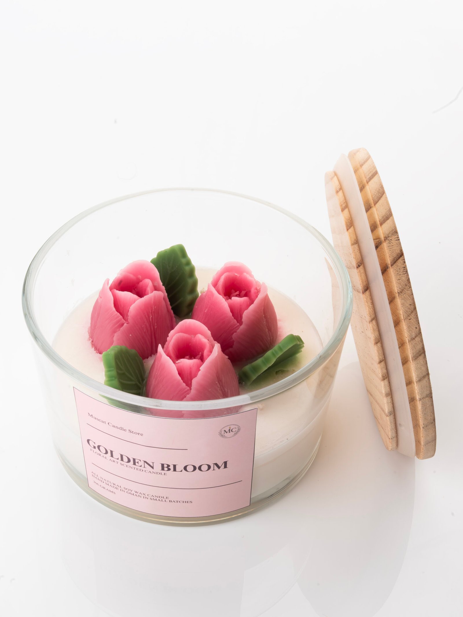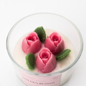 Radiant, graceful, and utterly captivating—the Golden Bloom Floral Art Candle by Muscat Candles Store is a true celebration of beauty. Handcrafted in Oman with 100% natural soy wax, this exquisite candle features intricately sculpted pink blossoms with green leaves, delicately arranged to resemble a blooming garden within a glass jar.