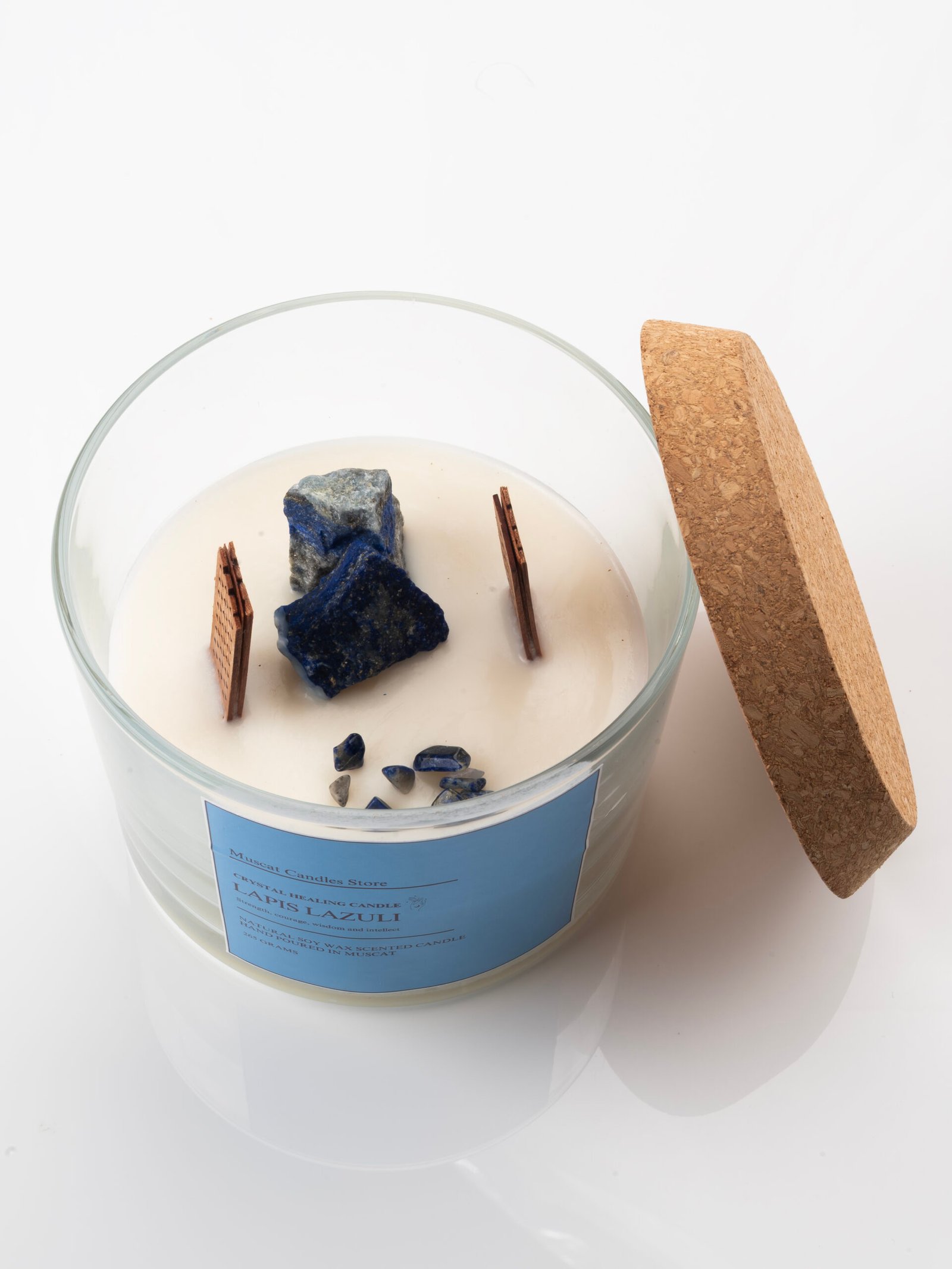 🕯️ Inspire your spirit and awaken inner wisdom with the Lapis Lazuli Crystal Healing Candle.