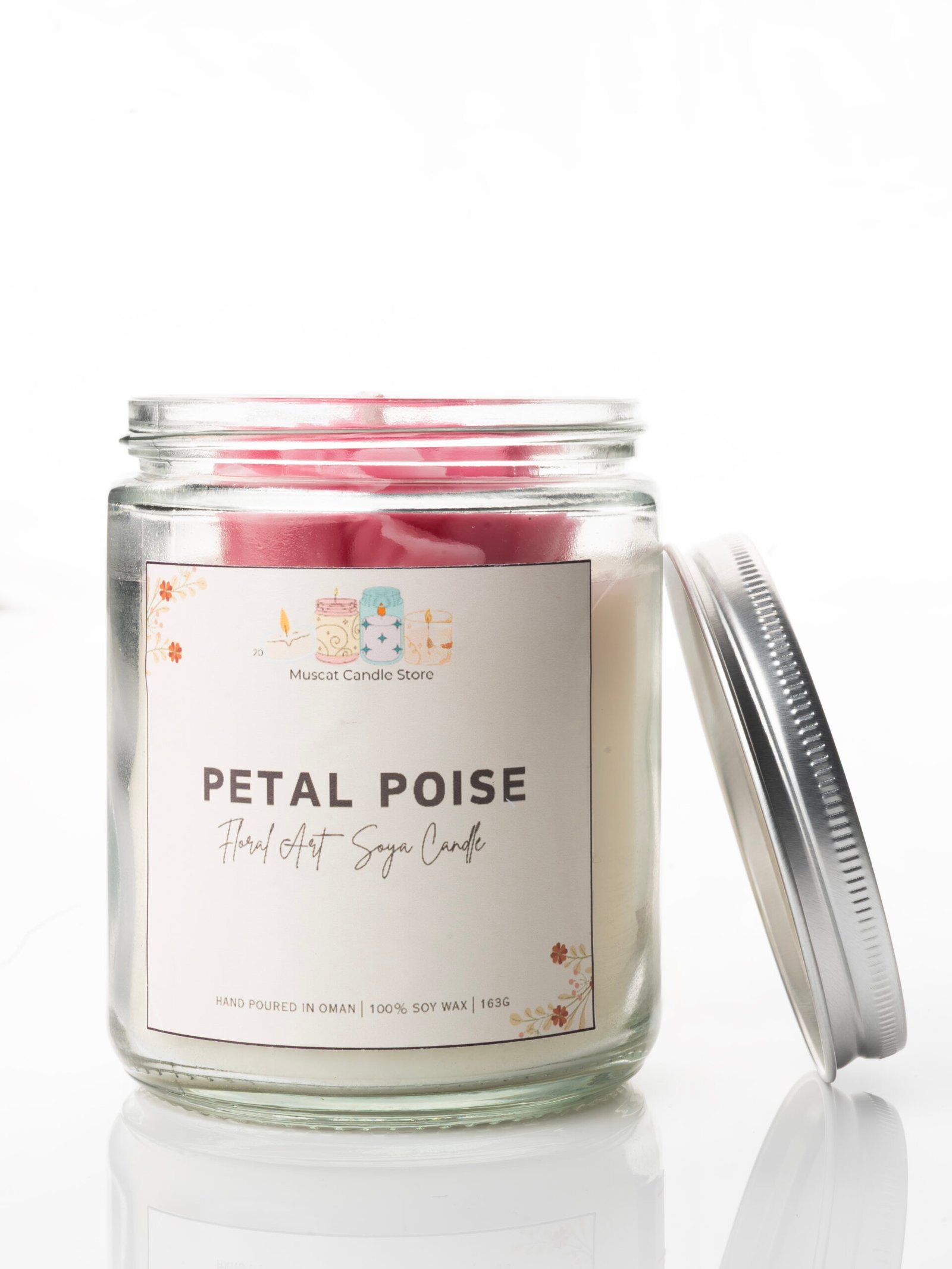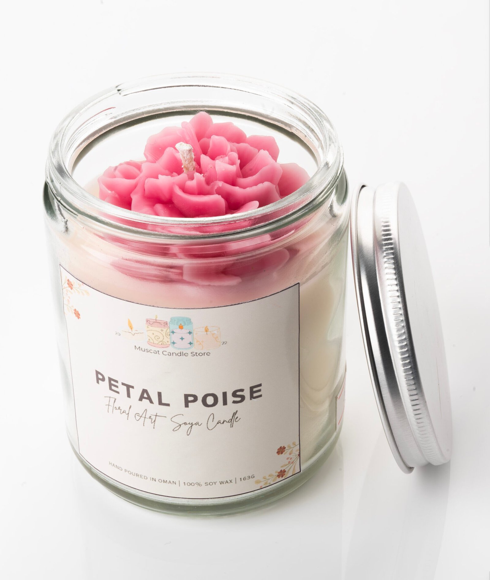 Delicate, elegant, and handcrafted with love—the Petal Poise Floral Art Soy Candle by Muscat Candles Store is a true work of art. Made with 100% natural soy wax and hand-poured in Oman, this 163g candle features a beautifully sculpted flower that blooms inside the glass jar, bringing charm and sophistication to any space.