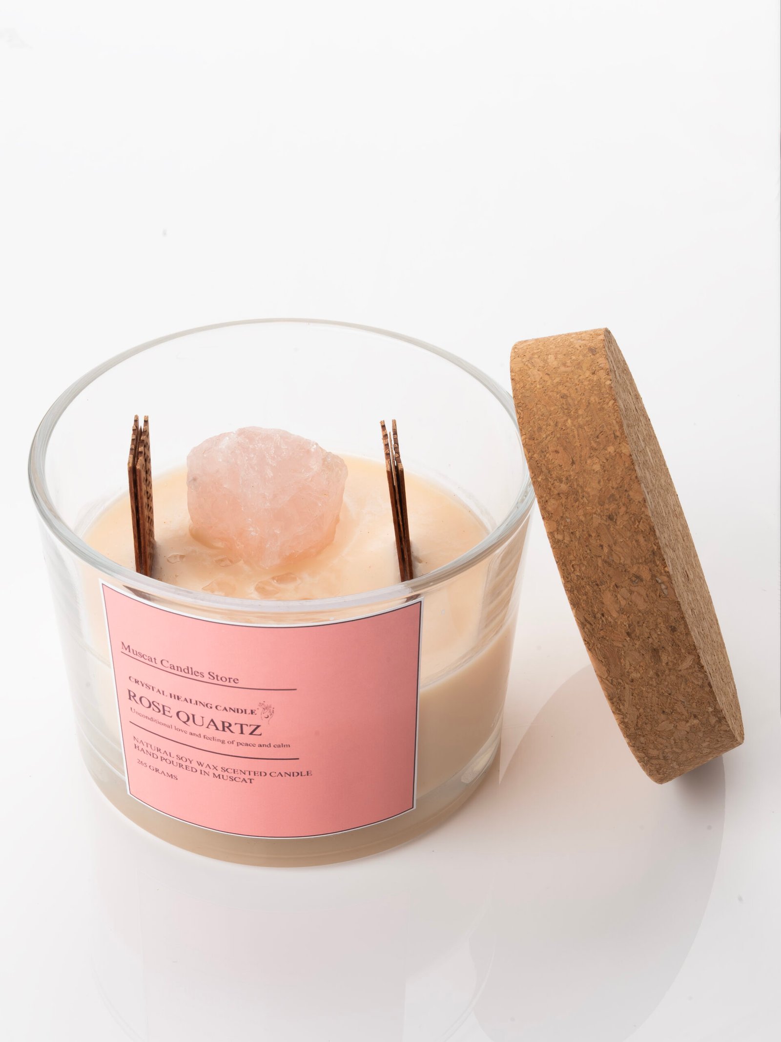 Embrace love, peace, and harmony with the Rose Quartz Crystal Healing Candle by Muscat Candles Store. Made with 100% natural soy wax and candle safe premium fragrance oils, this 265g candle carries the gentle, nurturing energy of rose quartz—known as the stone of unconditional love.